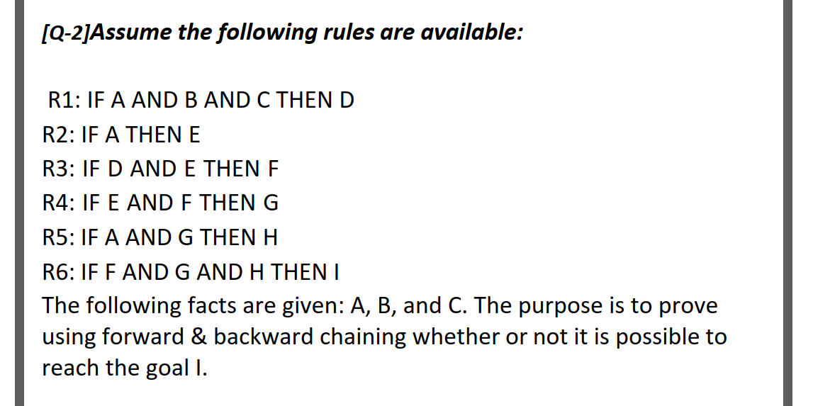 - applying it should add the R.H.S (D) to the facts list, indicate that by writing the newly added fact, followed by the relation that formed it (R1(A, B, C)).